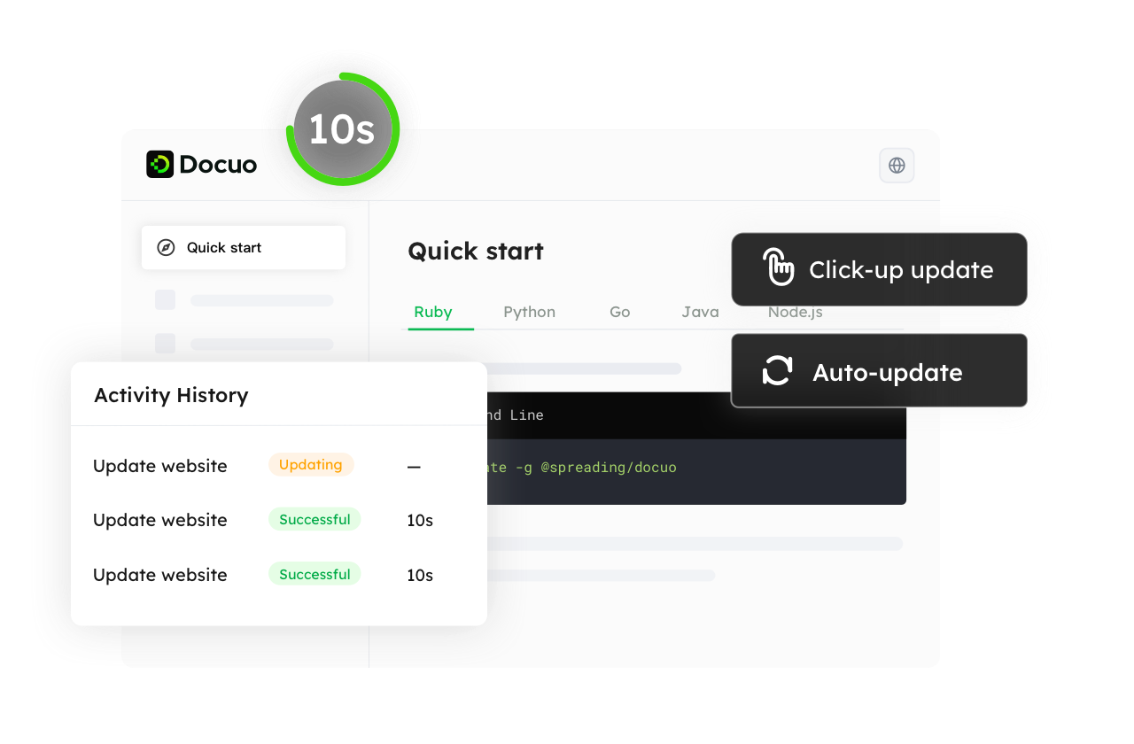 Deploy your docs website with a single click, or update automatically after editing the content. From editor to https just in seconds, deploy once, deliver everywhere.